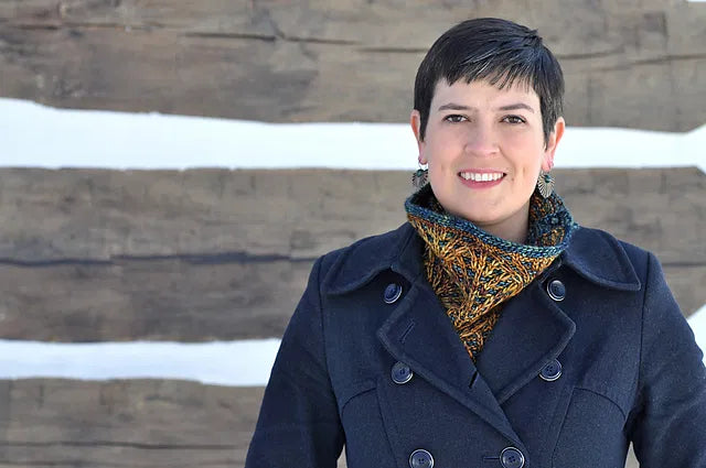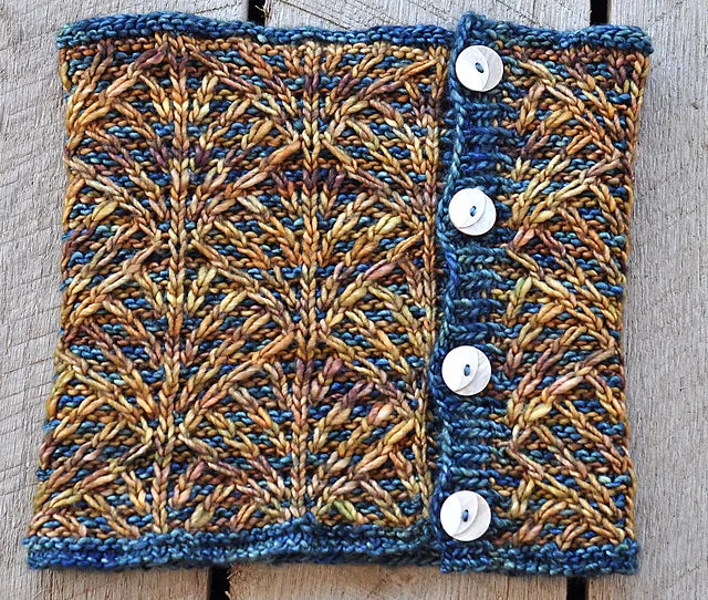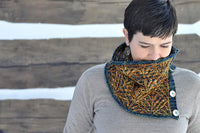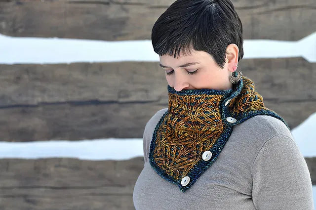 Worked in two colors of Mecha, the slipped stitches of this pattern provides a great opportunity to pair one a semisolid colorway with one of the highly variegated or watercolor colorways that Malabrigo is known for. Knit flat, it has a button band to provide a variety of different ways to wear the cowl.