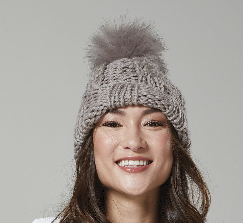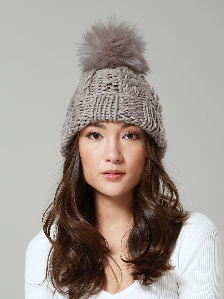 This lovely hat features a simple cable pattern and is finished with a pompom. It was designed by Quail Studio and is knitted in one shade of Big Wool, a 100% wool yarn.