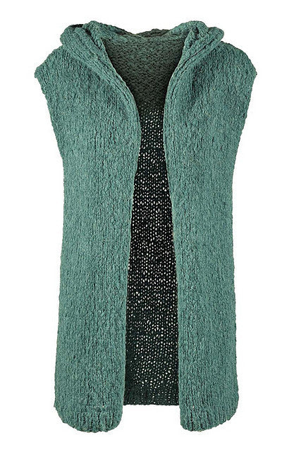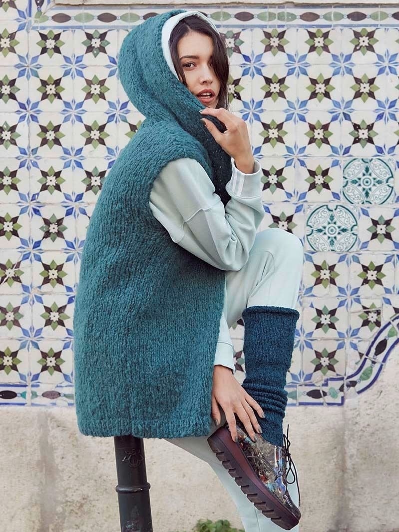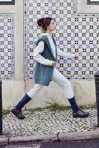 This waistcoat with hood was meant for easy escapes. Full of trust on her way seeking for some fine yarn.
