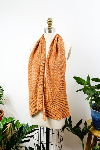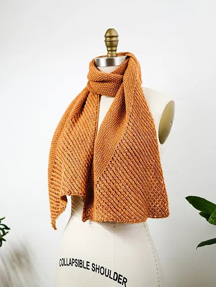 The Ebadi scarf is knit lengthwise, with a mesh-stitch panel shrinking at one end of the row while growing at the other, separated by a constant panel of seed stitch.