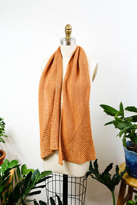 This wrap is worked sideways, from one long side to the other, with a pattern section at each end of the row and seed stitch in the center. A circular needle is used to accommodate the number of stitches.