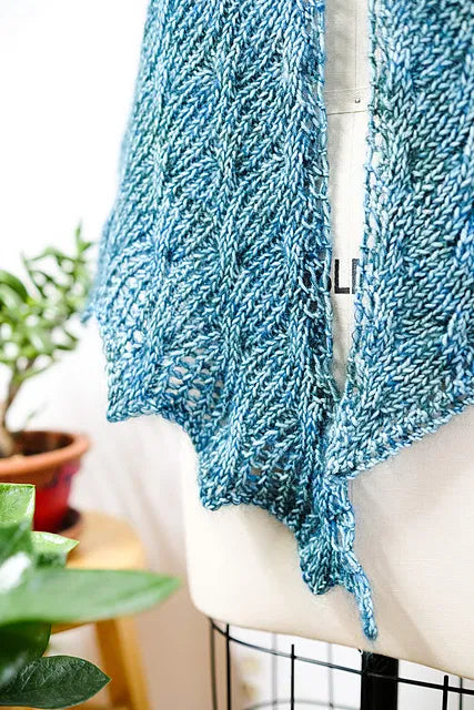 Feliz and Cabrito combine to give Elion’s ribbed and reversible cables a lofty feel and subtle coloration. Knitting begins at one narrow point and ends at the opposite short edge with an openwork pattern that produces a pointed bind-off.