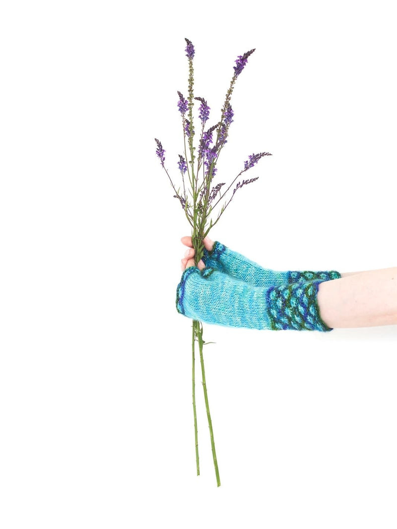Sizing note: The Daisy Stitch patt used at the cuff is not particularly stretchy, so if in doubt, knit a larger size. Lottie has narrow palms and is wearing the smallest size with no ease.
