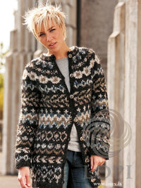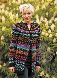 Jacket is worked in one strand of Álafosslopi and two strands of Léttlopi. Body and sleeves are worked in the round from lower edge to underarms, then joined to work yoke in the round. Round begins and ends with a p st for the steek at front of body. The front opening is cut open.