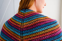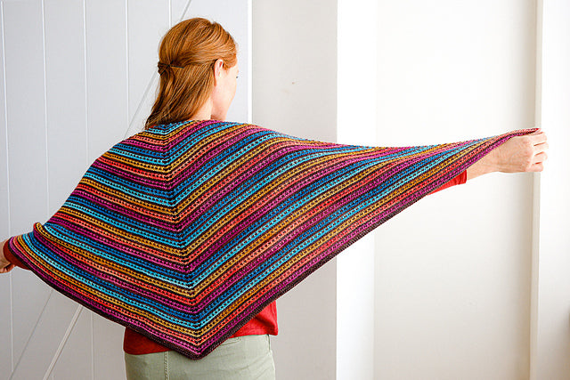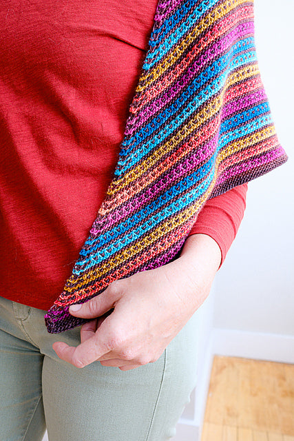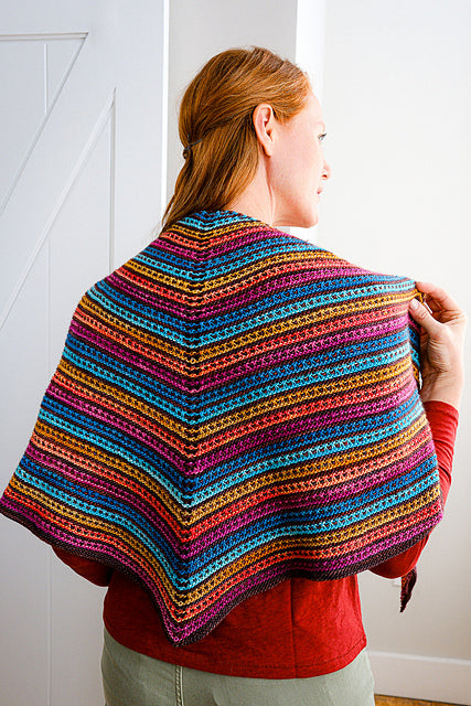 The newest Fino Mini-Skein Kit, Esme, comes together with a full skein of Fino in Poison to create this slip-stitch shawl rich in jewel tones. A slight variation on typical top-down shaping produces a triangle shallower and wider - a new shape to try out!