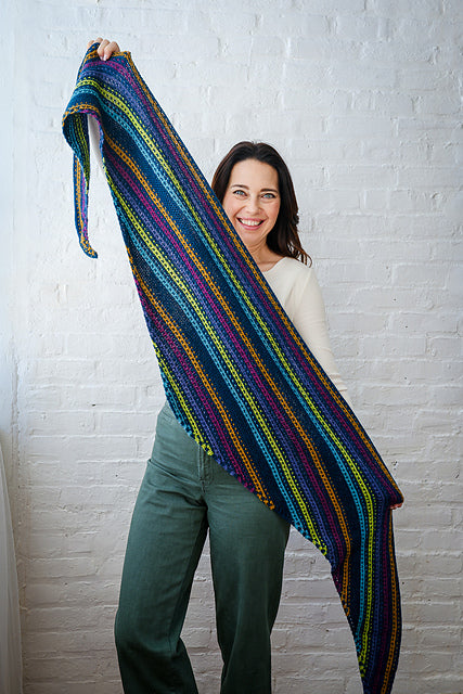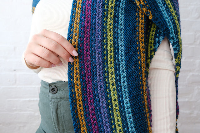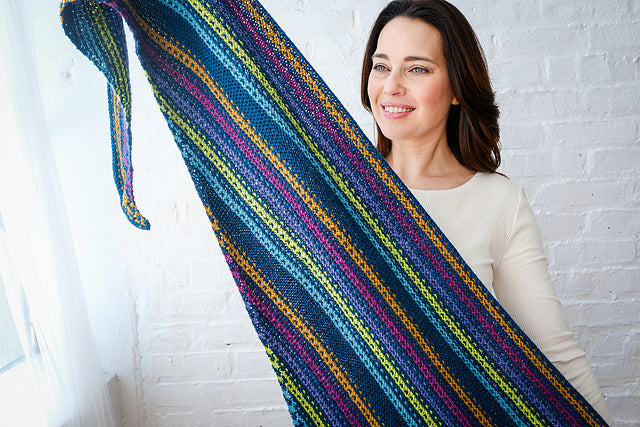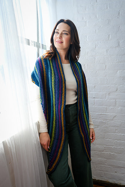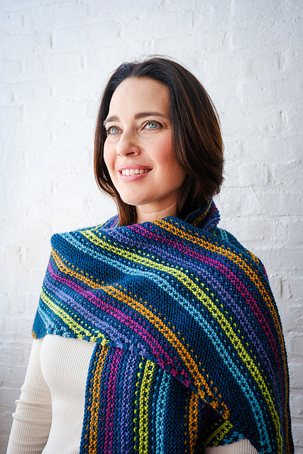 Esme’s Sister is a parallel to our Esme Shawl in Fino! This version uses Alpaca Heather for a thicker and cozier shawl, while still playing with a multitude of colors in a mesmerizing slip-stitch pattern.