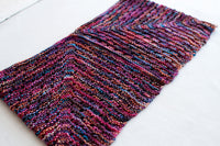 This cowl is a playful exercise in mitering to make the most of a space-dyed yarn: the increasing number of stitches keeps the colors in the yarn moving along the row to avoid any striping or “stacking”. A simple eyelet texture stitch draws attention to the change in knitting direction.
