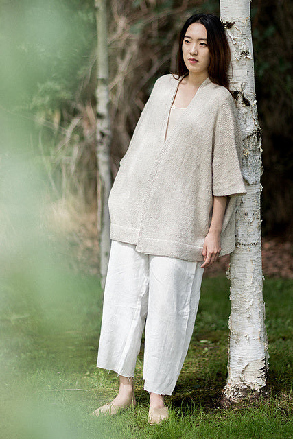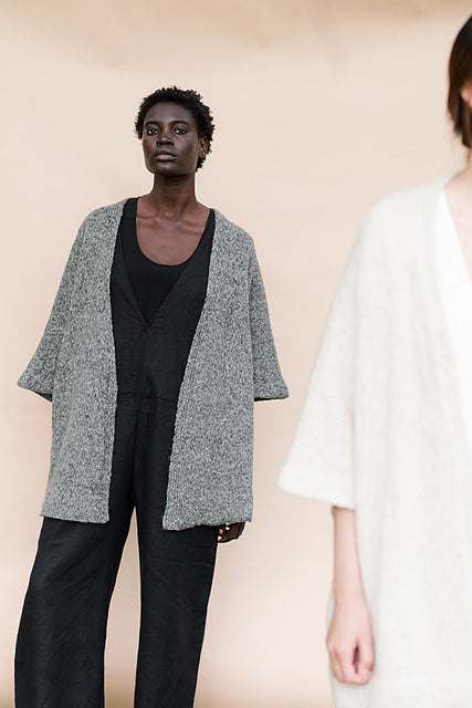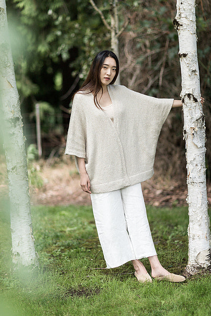 Cardigan is worked from the bottom up and seamed. Front bands are worked along with fronts, then joined to back neck sts. Shoulders are joined with three needle bind off. 2 sizes fit most sizes. Suggested sizes are 30-48” bust in size 1 and 48-68” in size 2.