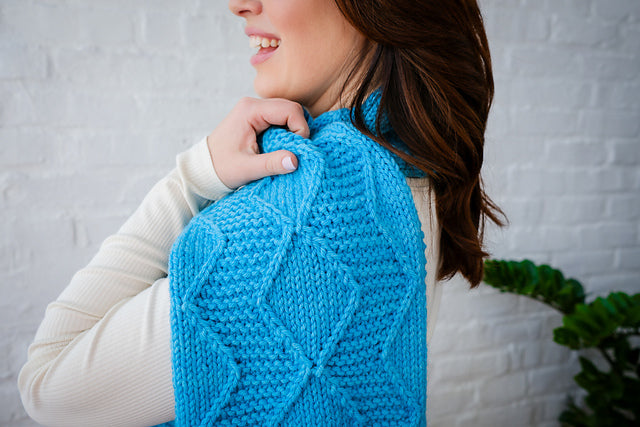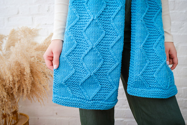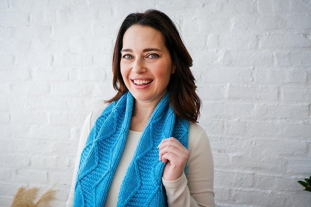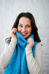 Enjoy working the rhythmic cable pattern highlights in all-gender design. Grab your new, cozy scarf in our bulky Cardo all season long!