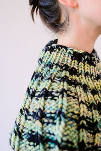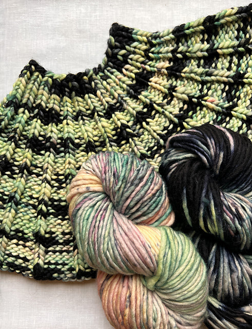 Featuring two new colors of Franca - Malefica and Bayou! Bayou is hand-dyed in shades of green, with pops of delicate peach and pink and a surprise speckle or two! Malefica has the same dye story as Bayou, but is then resist-dyed with black. Knit together in alternating stripes, the colors dance around each other to create a swirling color effect!