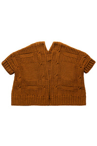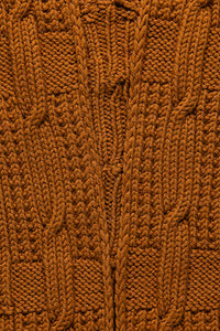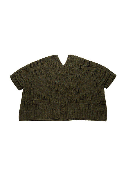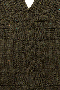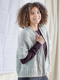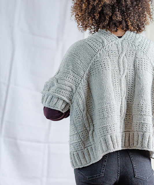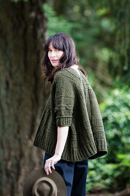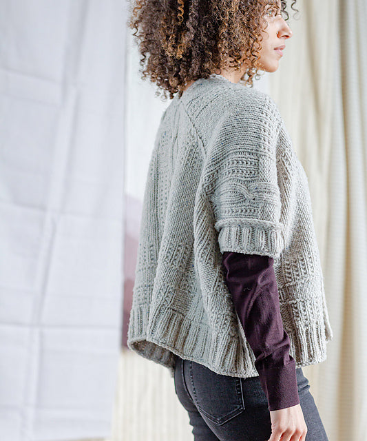 Ginsberg’s dramatic volume creates a striking silhouette and a cocoon of snuggly warmth. The knitting begins with a barn roof-shaped back piece, with the fronts worked on stitches picked up from the upper gambrel slopes. These projecting wings fold over the shoulders and are seamed to the back piece at the sides. Hem ribbing is worked along the fronts and back in one piece. Cables and blocks of textured stitches create a large-scale plaid effect on the fabric. Cuffs are knit in the round on stitches picked up after seaming to form a gentle puff above the elbow.