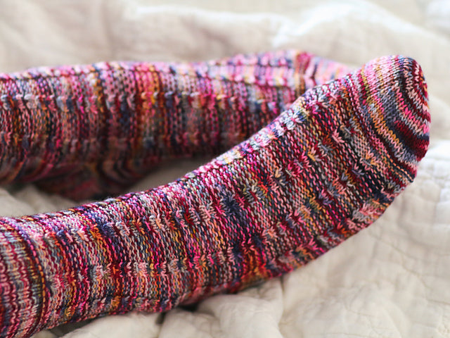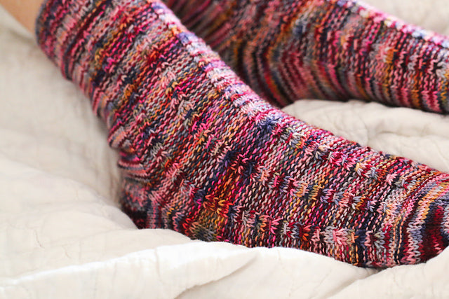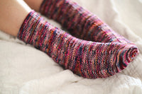 Knitted from the top-down with a traditional heel flap & turn. A sweet cable stitch turns variegated yarns into gobsmacking footwear.