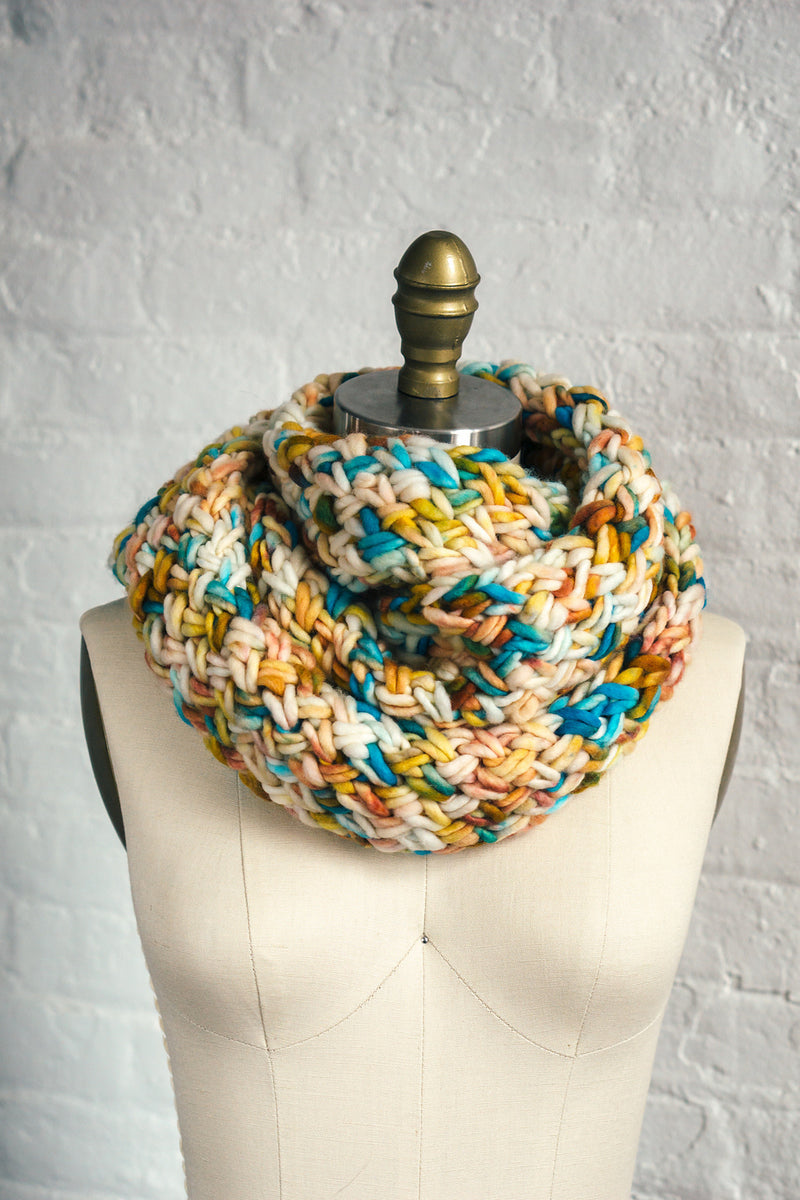 Big needles and soft, bulky yarn come together to create a big cowl - double-wrap or even triple-wrap it to keep warm on the coldest days! The Golden Touch Cowl is knit in Midas, one of the new space-dyed colors in Franca.