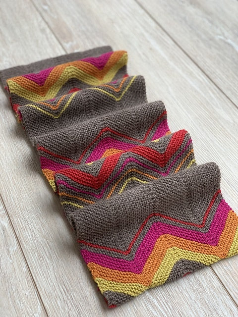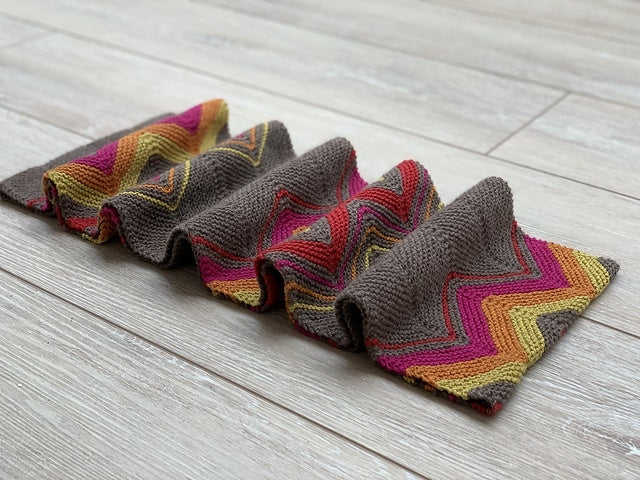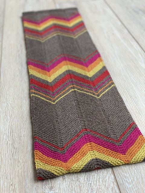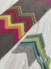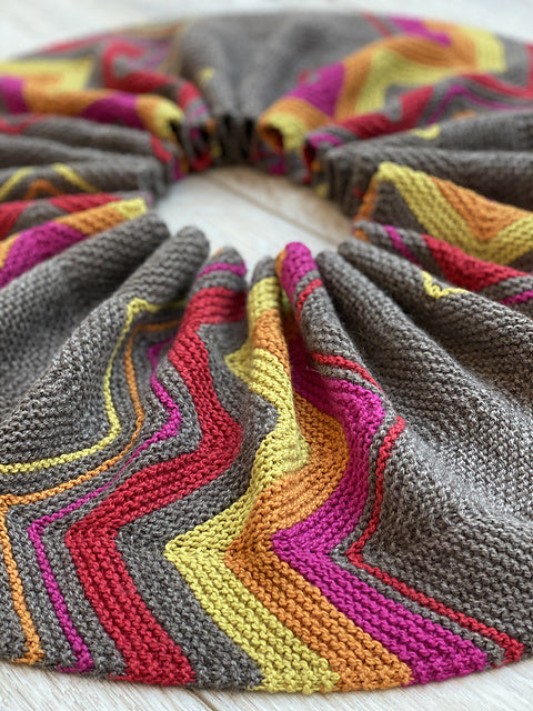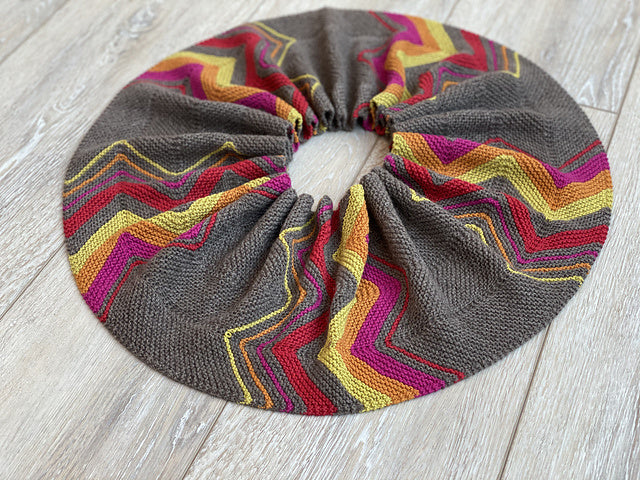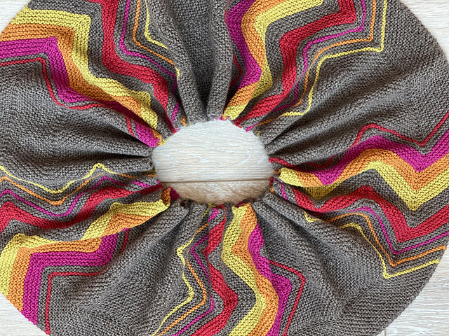 The chevron pattern of this cowl evokes the high mountain peaks of the Tibetan Plateau. The bold and bright colors of our Tibetan Cashmere are reminiscent of the colors of the lungta – little prayer flags you can find anywhere on the Plateau. Once the piece is joined together, it almost looks like a mandala , the spiritual and geometric symbol that is utilized to help people focus in on meditation and achieve a sense of oneness with the universe.
