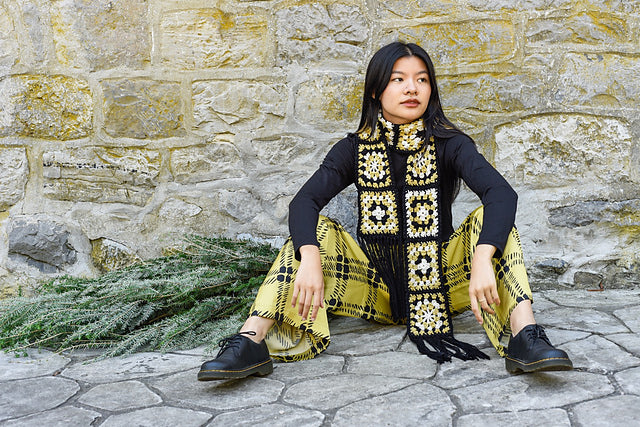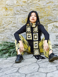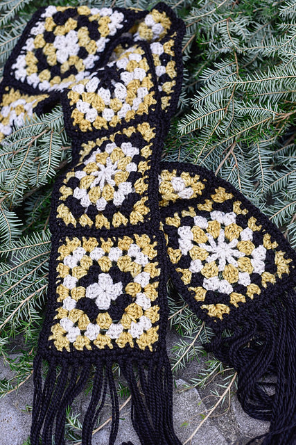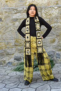 Scarf: 66” long and 6.5” wide, excluding fringe. Fringe: 10”