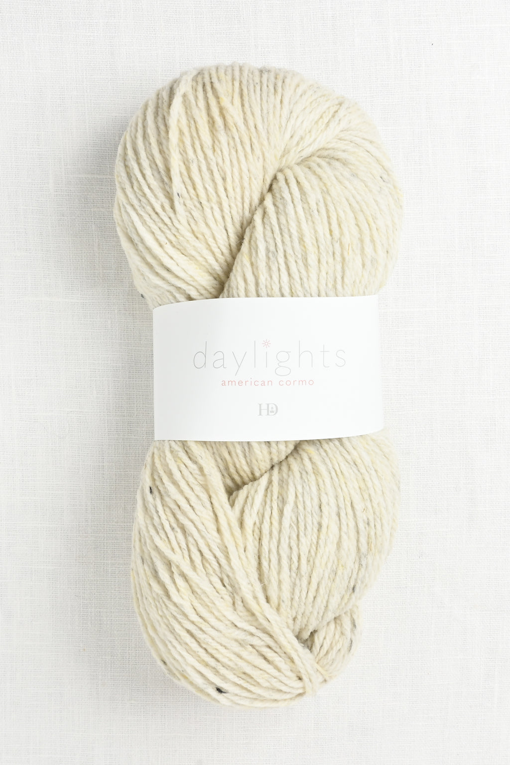 Daylights is a unique & amazing woolen-spun yarn spun with U.S. sourced Cormo & blended wool. Light & airy, yet very warm, this DK weight yarn is exceptional for knit sweaters, cardigans & accessories. The yarn will hold shape & wear very well. Each Daylights colorway is a shade of natural marbled with a hint of color. Each subtle colorway knits into sophisticated pieces that will become wardrobe favorites.