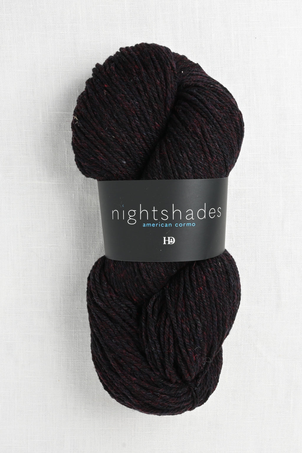 Nightshades is a unique & amazing woolen-spun yarn spun with U.S. sourced Cormo & blended wool. Light & airy, yet very warm, this DK weight yarn is exceptional for knit sweaters, cardigans & accessories. The yarn will hold shape & wear very well. Each Nightshades colorway is a shade of black marbled with a hint of color. From purple & blue to gold & magenta, the yarn knits into striking pieces that will become wardrobe favorites.