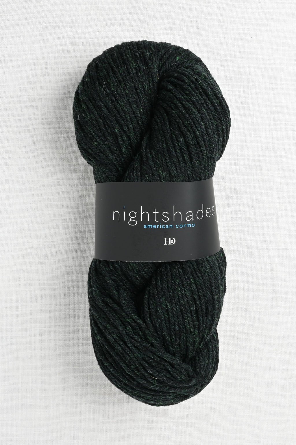 Nightshades is a unique & amazing woolen-spun yarn spun with U.S. sourced Cormo & blended wool. Light & airy, yet very warm, this DK weight yarn is exceptional for knit sweaters, cardigans & accessories. The yarn will hold shape & wear very well. Each Nightshades colorway is a shade of black marbled with a hint of color. From purple & blue to gold & magenta, the yarn knits into striking pieces that will become wardrobe favorites.