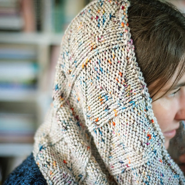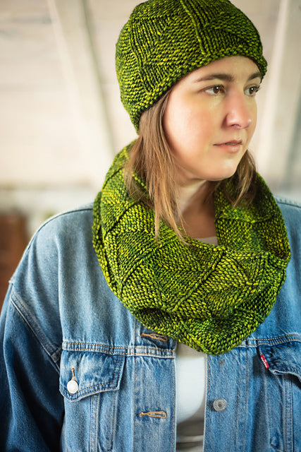 This uniquely textured cowl is knit in the round. Through the magic of knits and purls, the stitch pattern pulls in like an accordion. Alternate skeins in this project to avoid pooling, as this yarn is hand dyed and does not have a dye lot.