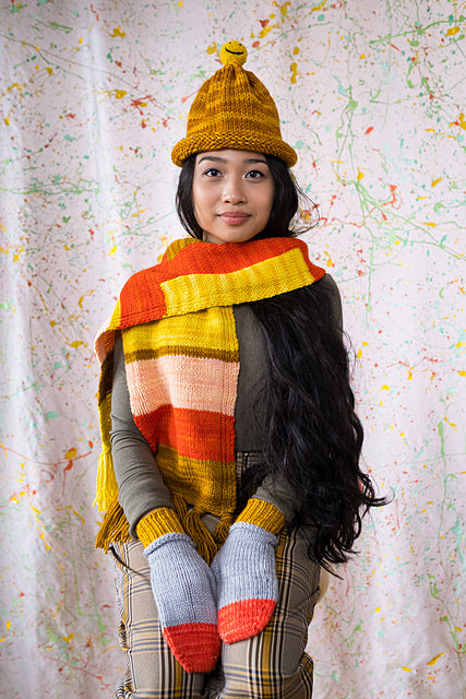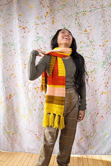 This stockinette scarf in cuddly Maxima lies flat at the edges, thanks to some nearly-invisible 1x1 ribbing at each side. A few broad stripes lead up to some entry-level intarsia that makes this a great introduction to the technique!