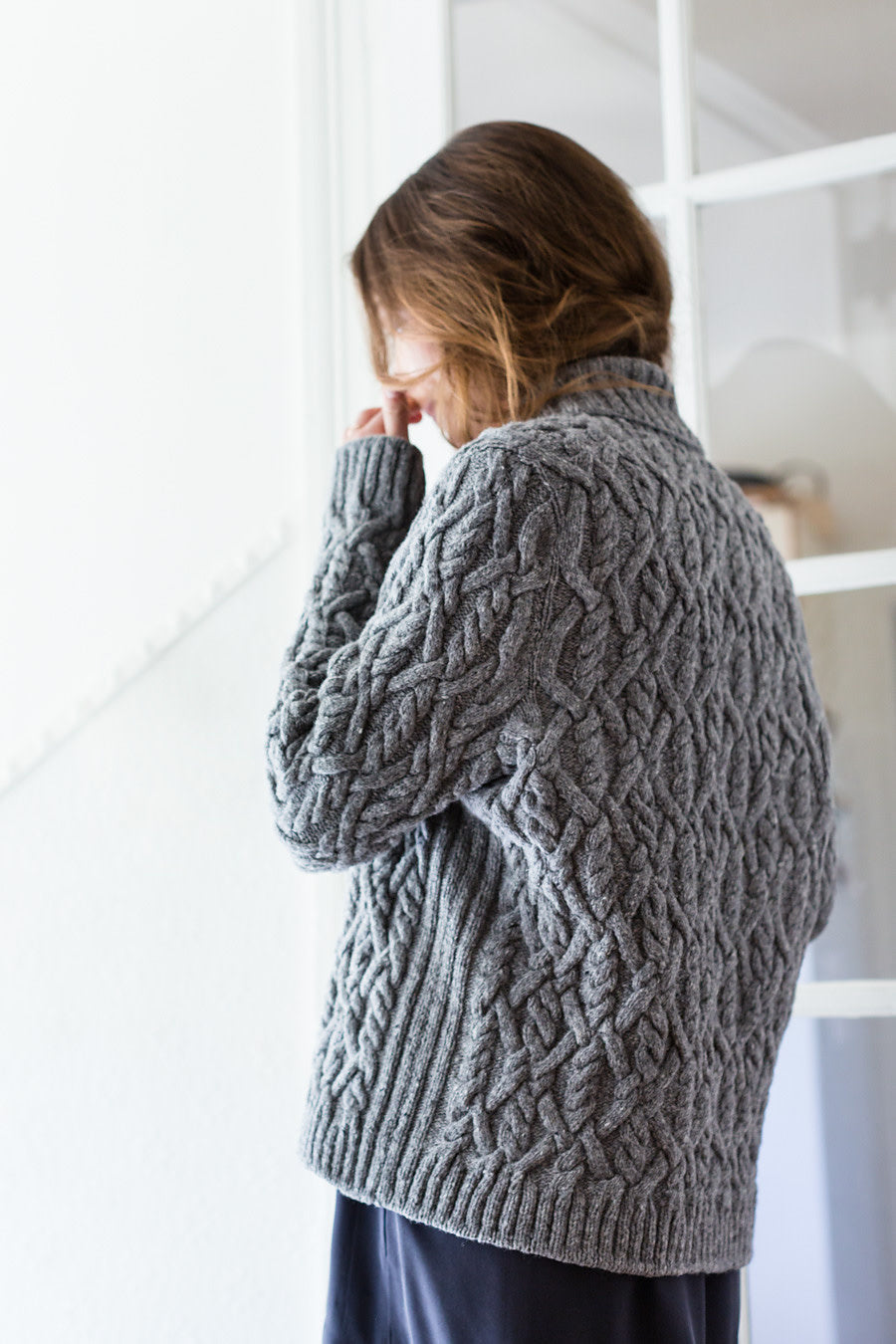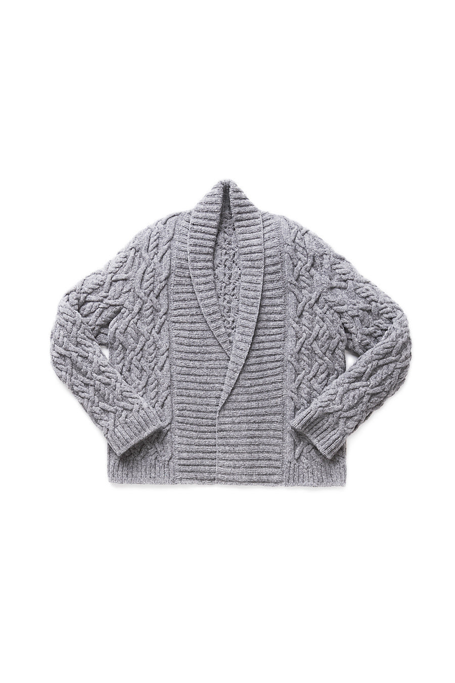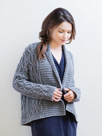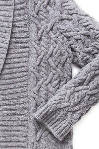 Add structural flair to your wardrobe with a plush cabled cardigan. Wide bands of front ribbing fold back to form a collar and create an architectural silhouette. The densely worked fabric features rope cables spliced into a lattice for vivid texture and cozy warmth. The double-ribbed hem extends into ribbed side panels that punctuate the cabled motif for visual balance. Ilia’s boxy fit makes for easy layering; the fronts may be pinned to close if you wish, so choose a size that gives you 3-5” of ease with the fronts overlapped.