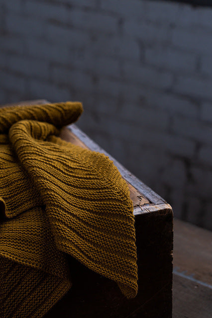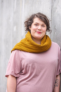 We combined stitch patterns and fabric gauge specifically for the DK-weight Targhee Wool, Arbor; the yarn’s three-ply construction and smooth twist lend crisp stitch definition to the clean lines of the design. Interval is equally lovely in the wool-cotton yarn, Dapple. At a relaxed gauge of 5 stitches-per-inch, the finished shawl is a great mid-weight fabric for neckwear that keeps you toasty but doesn’t overwhelm.