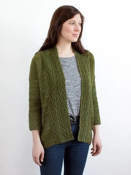 Finished Bust Circumference: 38¾ (42, 46, 50, 53¾)” with edges of 5” front band meeting in the center