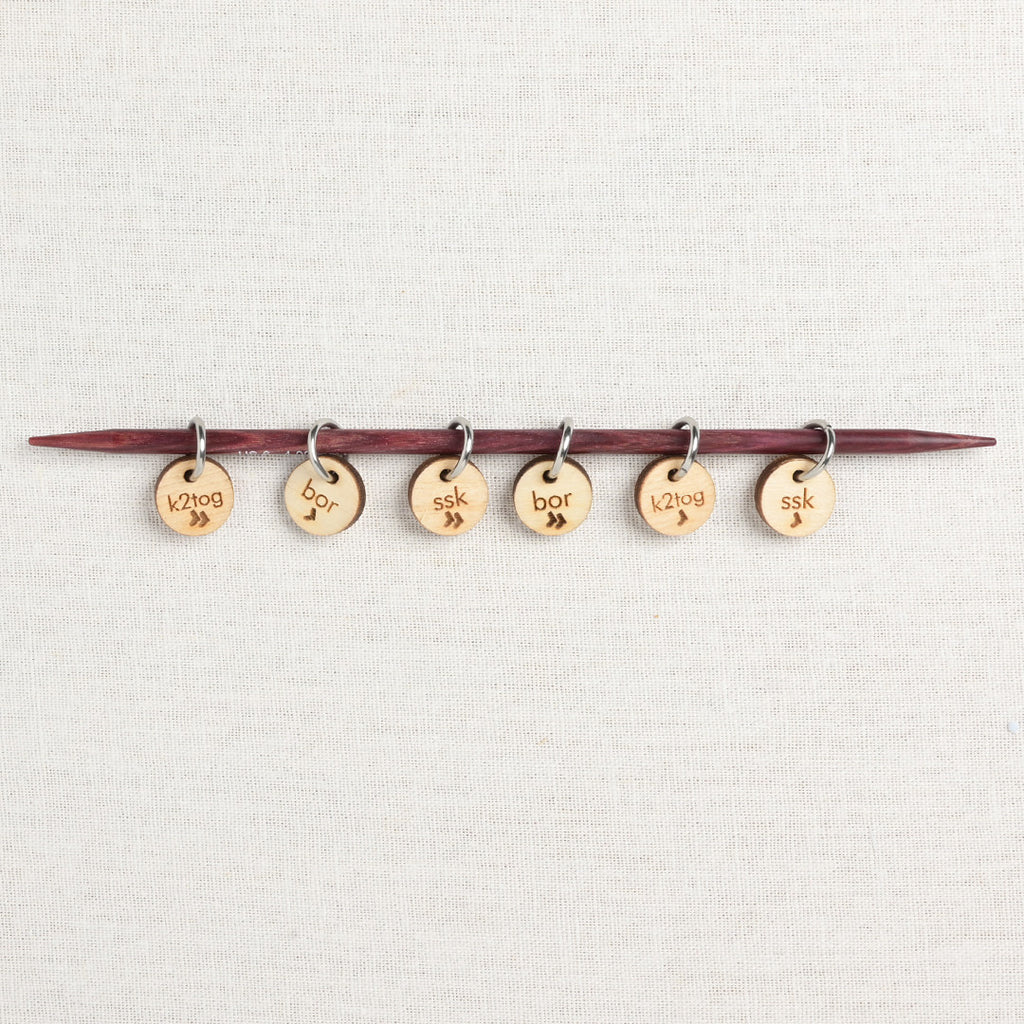 Make sock knitting even more enjoyable with this handsome set of wood instruction ring stitch markers. Keep your place, as well as mark important increases & decreases. The set includes 2 x ssk (slip slip knit), 2 x bor (beginning of round), & 2 x k2tog (knit 2 together). Accomodates up to size US 7 needles.