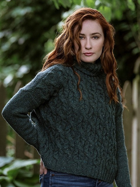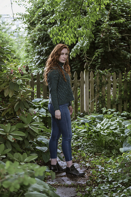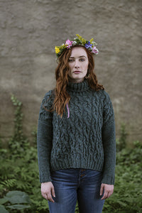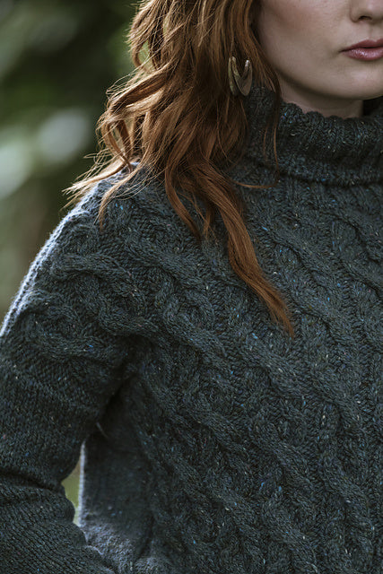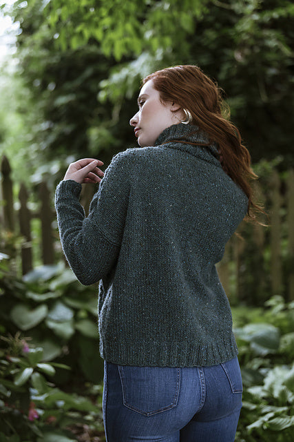 Kelby is worked in pieces from the bottom up. Once the pieces are complete, the shoulders are joined with a 3 needle bind off, sleeves and sides are seamed, and stitches are picked up to work the turtleneck.
