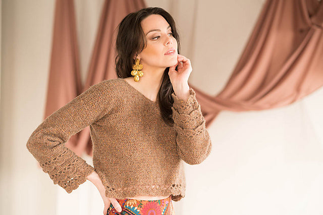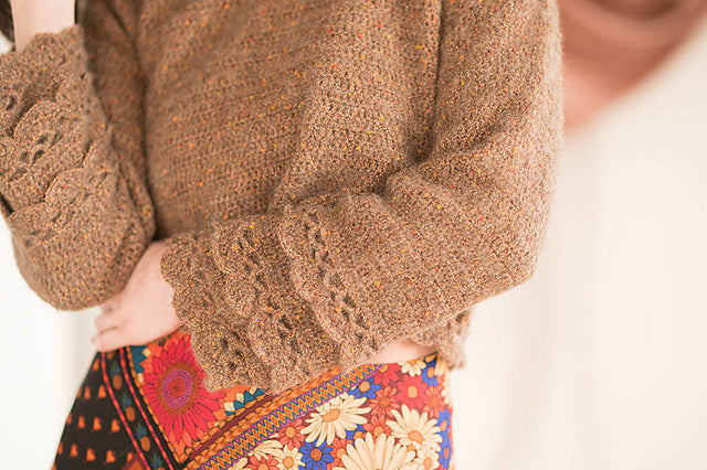 Charming cuff details make this crochet pullover pop. Worked in double crochet, in the round to the armholes, then divided for back and front, with sleeves worked down from the armholes.