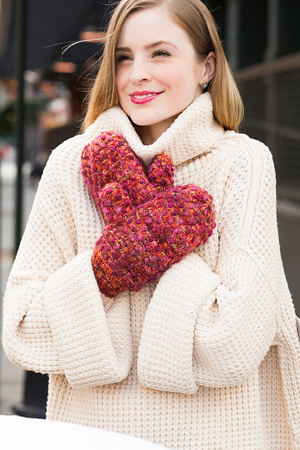 Wrap your hands in warmth with these cozy thrummed mittens. The body of the mitten is knit with Mechita and the thrums are Rasta!