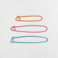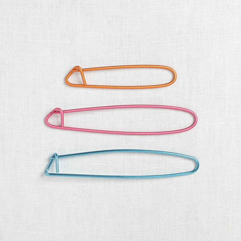 No more waste yarn! Holding stitches is now a breeze with these smooth, aluminum, locking stitch holders. Includes three “safety pin” style stitch holders in three different sizes.