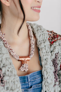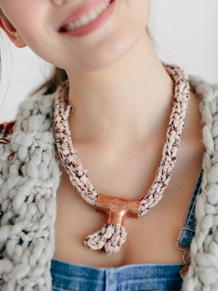 Our resident jewelry designer and all around craft expert, Nicolle Diver, has done it again with another beautiful and unique necklace! Knit a quick I-cord and take a trip to your hardware store and VOILA, you have the Lariat Necklace. One skein of our Wildflower yarn will yield many necklaces.