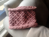 Twisted cabled and purl stitches combine to make a cozy lattice effect cowl. Finishing: Pin cowl to measurements. Cover with a damp cloth, leaving cloth to dry. Sew back seam. Cable pattern chart is provided in pdf download.