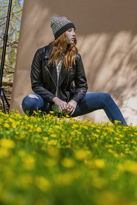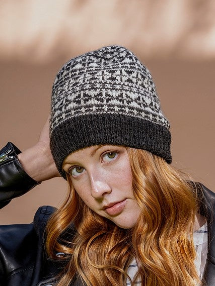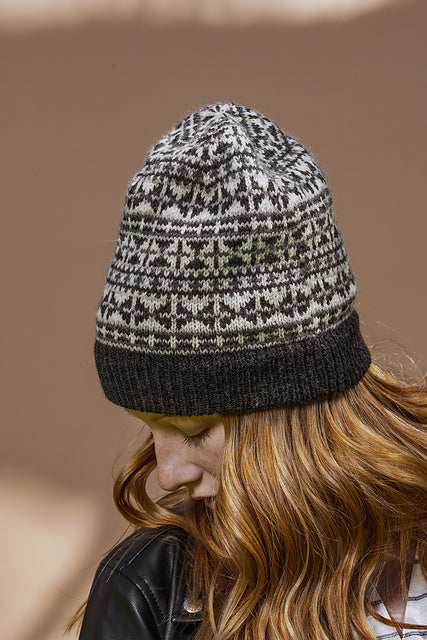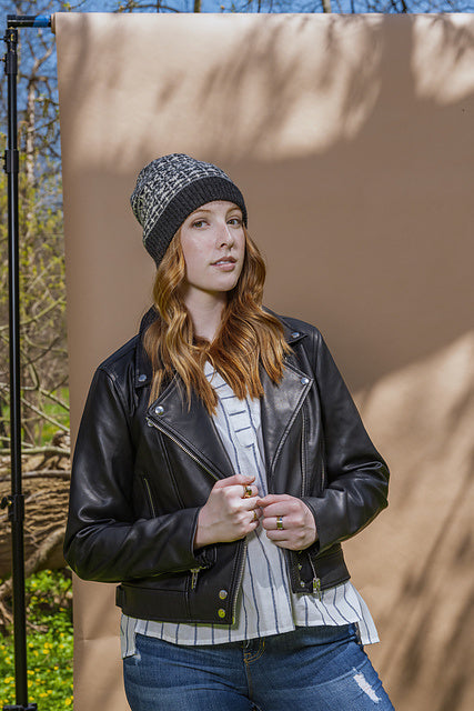 Kelbourne Woolens Camper (100% wool; 200 yards/50 gm skein): Charcoal Heather 026 (MC), Graphite Heather 034 (CC1), Gray Heather 058 (CC2), Natural 105 (CC3), 1 skein each.