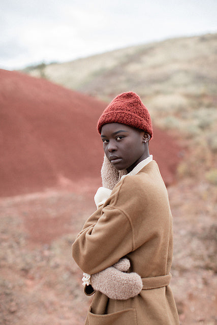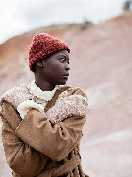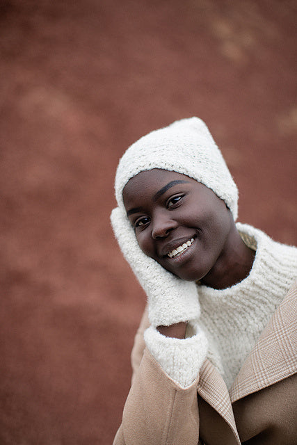 Hat and mitts sample 1 (color no. FB00) are on female model.