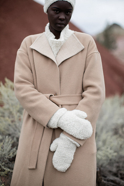 Mitts sample 2 (color no. FB02) is on female model.