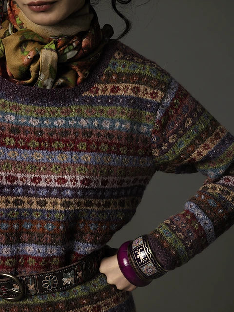 Knit this ladies colourful tunic. A design by Kaffe Fassett using our wonderfully tweedy yarn Felted Tweed DK (wool, alpaca and viscose), this scoop neck fairisle tunic has set in sleeves and is ideal for winter layering.