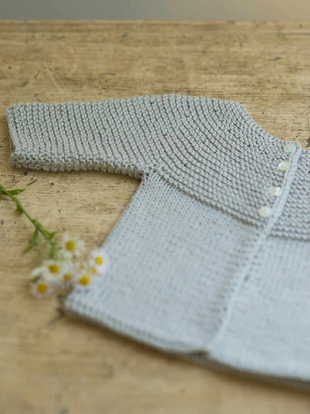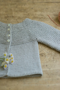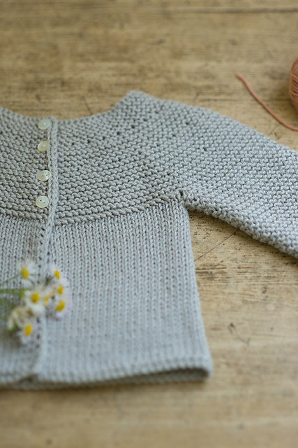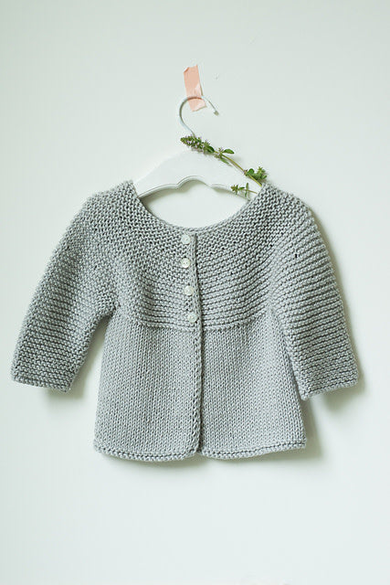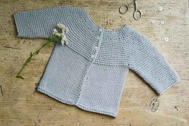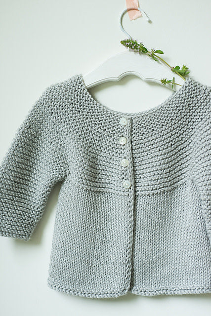Cardigan is knitted from the top down with an applied i-cord edge and round yoke. The yoke and sleeves are worked in garter stitch, and the body in stockinette. Button holes are worked into the yoke.