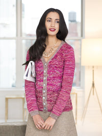 Cardigan body is worked in one piece back and forth in rows on the circular needle with the contrast-color rib borders knit while working the body chart pat. The two sleeves are worked from the cuff edge in rounds of St st on the dpn, then completed in rows while working the cap shaping.