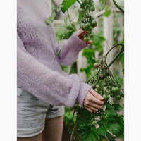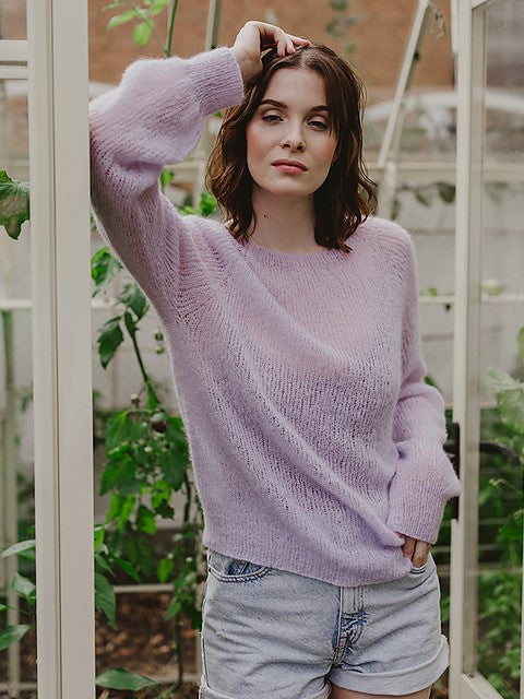 LUELA is a feather-light classic pullover worked seamlessly top down in loose stockinette stitch framed by tight ribbed cuffs and hem which give the final piece a good hold. Work begins at the neckline down to the shoulders where body and sleeves are se-parated and worked in rounds one after the other. Increases are done along four raglan lines. The design is simple: the body and long sleeves are cut straight.