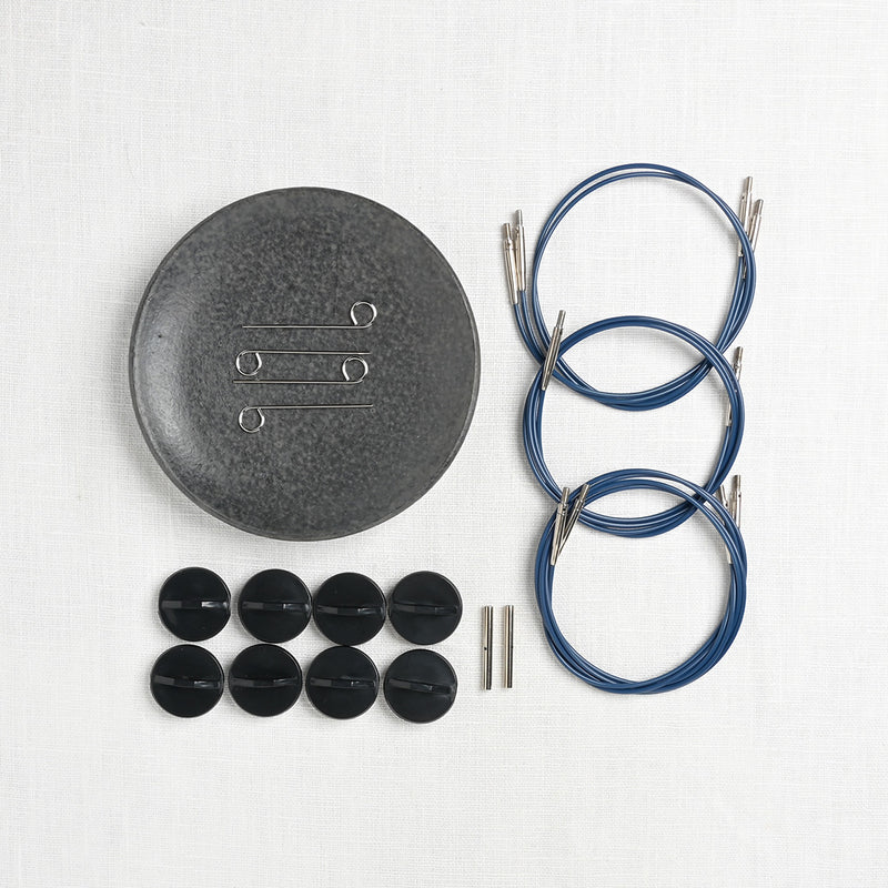 - 5 blue, memory-free, swivel cords to create 2 x 24”, 2 x 32”, 1 x 40” length circular needles