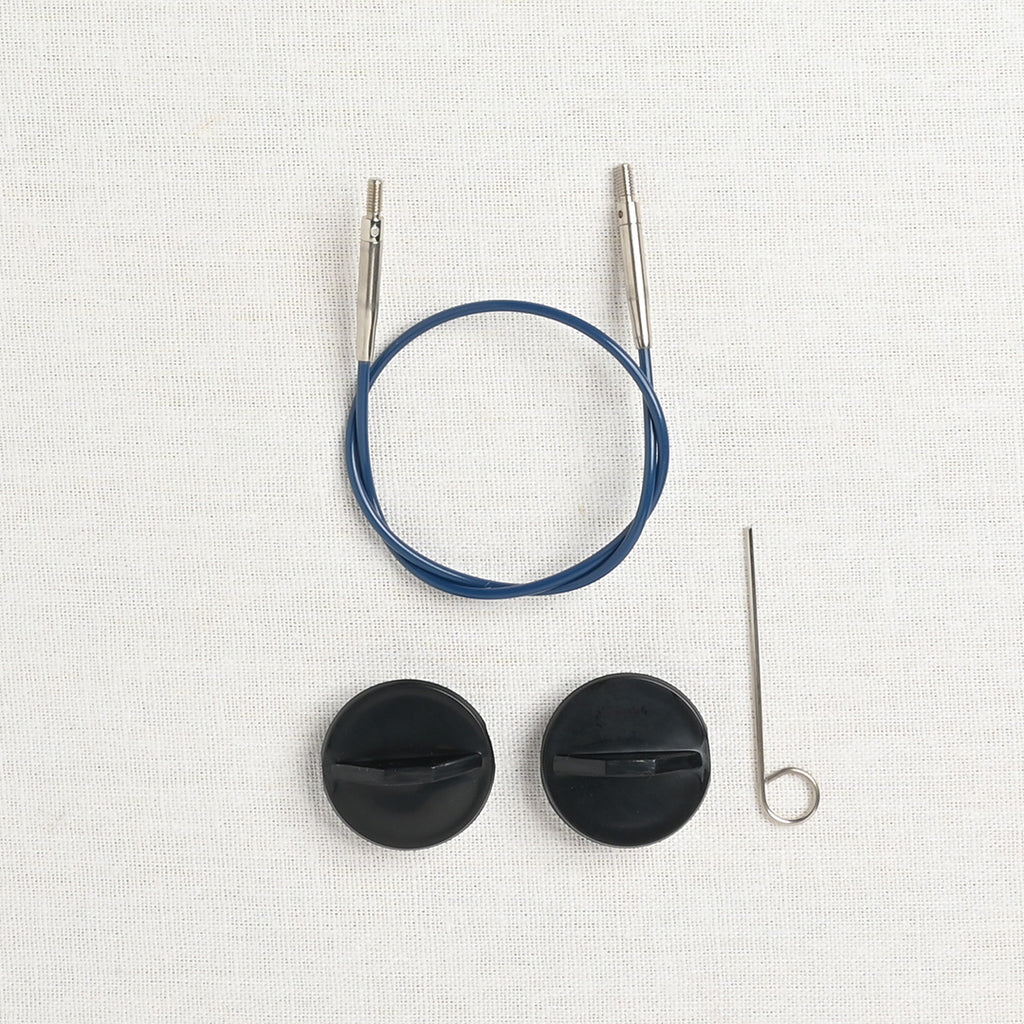 Knitting is even more relaxing with these innovative swivel cords. The deep indigo cords are memory-free & allow the cord to swivel 360 degrees in the coupling. Each cord comes with two black end caps, as well as a cord key to tighten the needle to the cord. The cords also have a lifeline hole on each end. Cords work with all Lykke interchangeable needles.