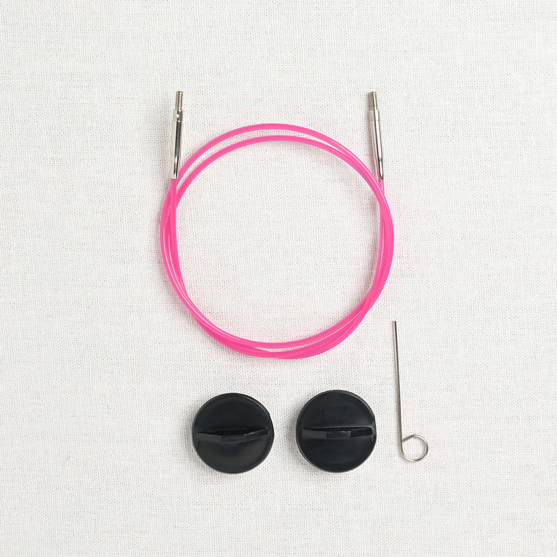 Knitting is even more relaxing with these innovative swivel cords. The pretty blush pink cords are memory-free & allow the cord to swivel 360 degrees in the coupling. Each cord comes with two black end caps, as well as a cord key to tighten the needle to the cord. The cords also have a lifeline hole on each end. Cords work with all Lykke interchangeable needles.