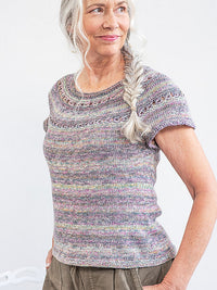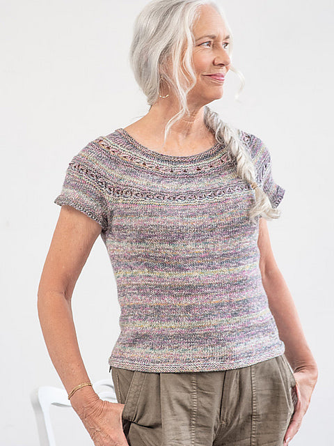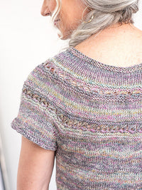 Madeleine is an elegant top down tee featuring faux broomstick lace stripes and garter stitch edging.