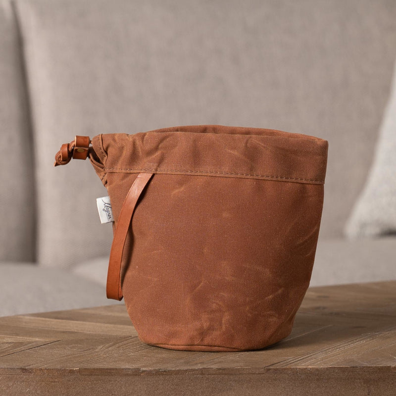 The bags feature a leather side handle, as well as a leather drawstring to cinch the top closed. The bag is perfect for storing projects at home away from little hands & paws & is also ideal for travel.