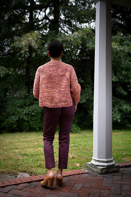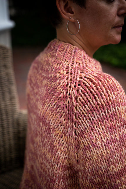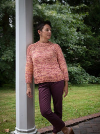 This garment is worked in one piece in from the top down with short rows to raise the back neck. After completing the raglan yoke, the stitches are divided for working the lower body and sleeves separately from the underarms down.