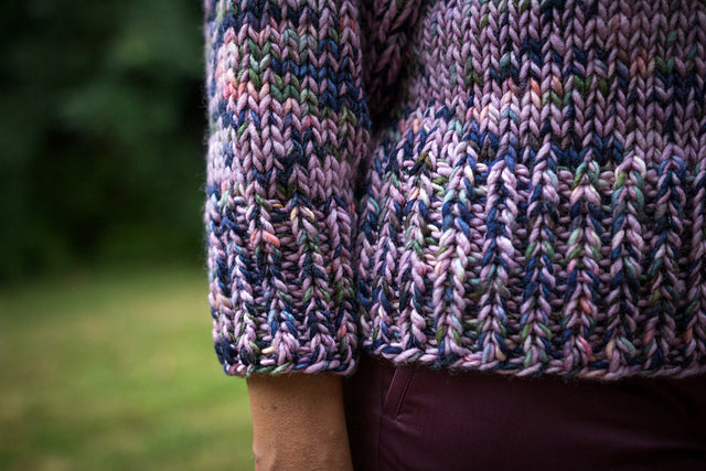 There are two finishing options: split hem and ribbed. The split-hem version separates for front and back and works a basic eyelet pattern to add interest. The ribbed version has a stockinette body and exaggerated ribbed hem. Play with color and finishing options - Mansard is your canvas!