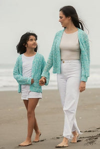 This sweater is crocheted from the bottom up in pieces. The collar is added after assembly.
