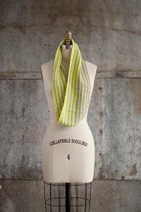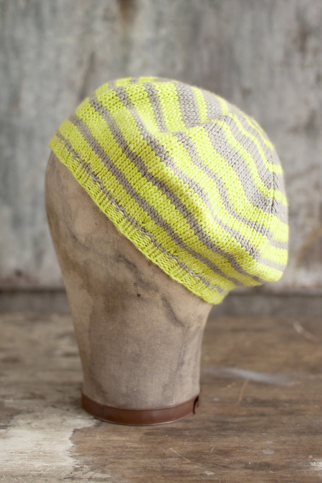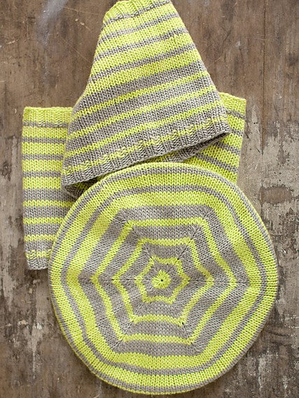 This beret is worked in the round from the bottom-up with a fun stripe pattern. The coordinating cowl is worked in the round; the resulting “wrong side” also has an attractive pattern.